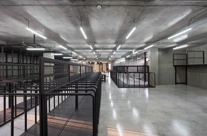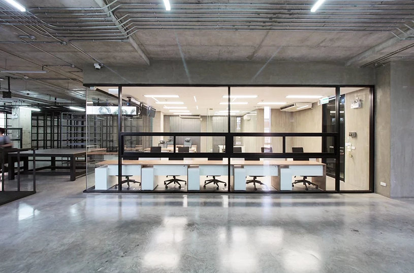 二樓辦公室裝修中充當皮革展示區和辦公空間。每層的窗戶隔片都是可以旋轉的,而且窗戶是凹進去的,這樣帶來的是間接的光線,不會損傷皮革制品。辦公區和展示區都是很寬大的,整體有著很濃的工業風格。