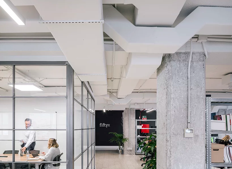MARIANO是這家辦公室裝修設計的負責機構,他們將現有的工業建筑的特點(具有規則柱子和梁的混凝土結構)結構元素,并且撤掉了原有的吊頂,保留原有的水磨石地磚,花崗巖的大堂和大面積的石灰石外墻。