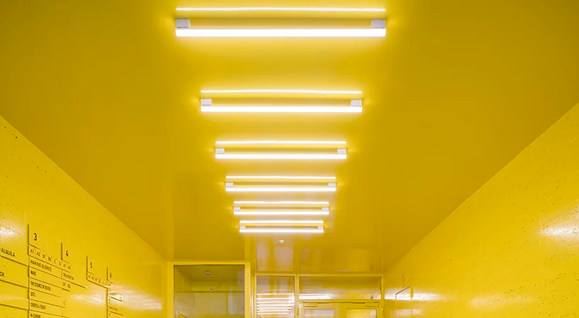 從地下停車場開始,黃色涂刷在所有的公共區和流通區域,只有現有的水磨石地板從大膽的色調中脫穎而出。不同的樓層有著不同的色調,天花板上,燈具和周圍的白色墻壁突出。
