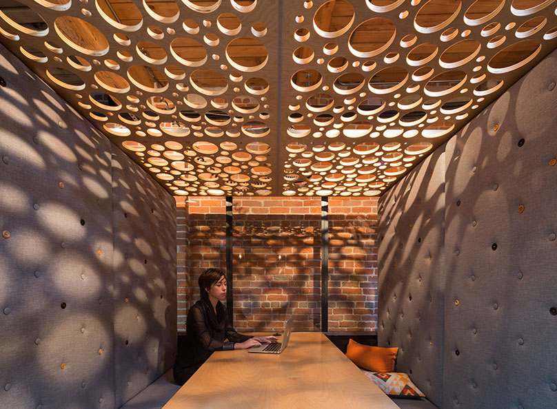 這里的意圖是補充基地建筑的工業圍護細節與工業金屬內部系統和陳設是當地制造,以創造一種手工的審美。辦公室裝修從自定義的雕塑照明吊墜,就像連接工作空間和社交空間的云一樣飄浮,到探索“室內自然”概念的巨大苔蘚墻,再到裝飾家具上各種搭配不當的木按鈕等最小細節,干預措施旨在給公司員工帶來古怪的愉悅和好玩的刺激。