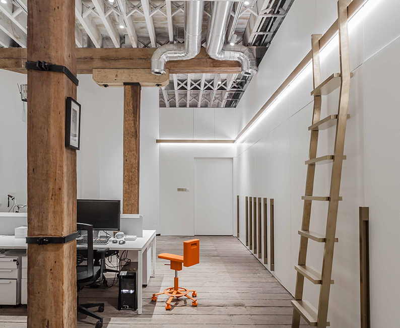 辦公室裝修除百年木結構外,采用黃銅、玻璃、大理石、不銹鋼等現代材料,實現歷史與現代的對話。建筑師沒有按照傳統辦公室裝修設計中常見的隱私或效率水平來組織空間。相反,他們根據相互作用的可能性來安排空間。工作區位于中間,由輔助材料空間、觀眾空間、金色書架和討論區包圍,成為信息處理中心,增加了互動的可能性。