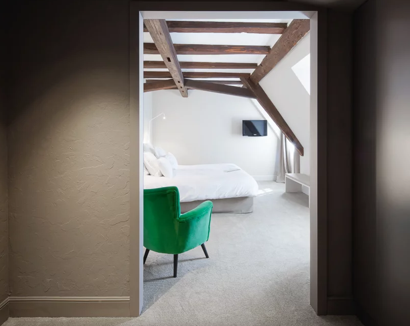 通過單色“鎖”(夜藍色或灰褐色)進入房間,可通往浴室,衛生間和房間。這個空間還包括一個相同顏色的櫥柜,包括衣柜和帶迷你吧和咖啡機的服務柱。保留了木梁和鑲板。桌子和軟墊長凳完成了布局。