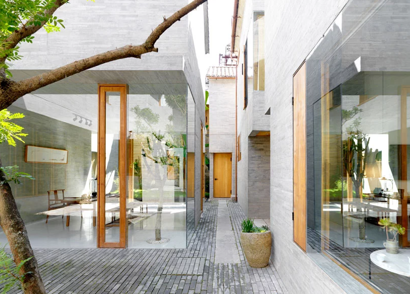 庭院經(jīng)常有一天中某些時(shí)間太暗的缺陷; 然而,sunyata酒店沒有這個問題。朝陽建筑師設(shè)計(jì)了一個允許光線和視覺透明度的方案,使庭院成為一個開放的空間,光線投射到各個角落,陰影和陽光混合在一個舒緩的陰陽之中。玻璃飛機(jī)是如此專業(yè)地安裝,即使是人類也會懷疑它們的存在/知道空間的起點(diǎn)和終點(diǎn)。